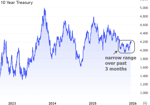 On the data side, next Tuesday brings the much-anticipated November jobs report (originally scheduled for last Friday, but delayed by the shutdown). If the report shows meaningful labor-market weakness, another Fed rate cut suddenly looks more likely. Longer-term rates would probably move lower in anticipation—though they could still be pushed around by other data.