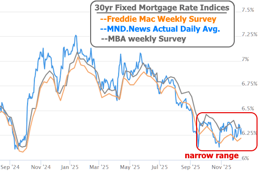 Thanks to very transparent Fed communication and trading tools like Fed Funds Futures, the market has had a high level of confidence about recent Fed cuts. Every cut in 2025 was more than 90% priced in well before the official announcement. This week was no different. In fact, the market’s reaction stayed comfortably inside the normal weekly range for longer-term rates.